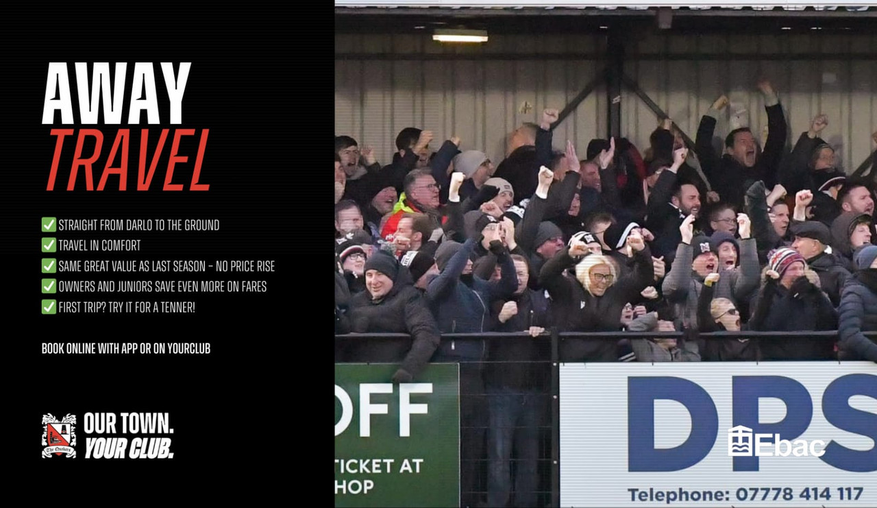 DFCSG run coaches to all away games across the season. These luxury coaches are supplied by Atkinson’s Coaches and are equipped with toilets. The coaches leave from Park Place, Darlington and arrive at their destination around 90 minutes before kick-off.